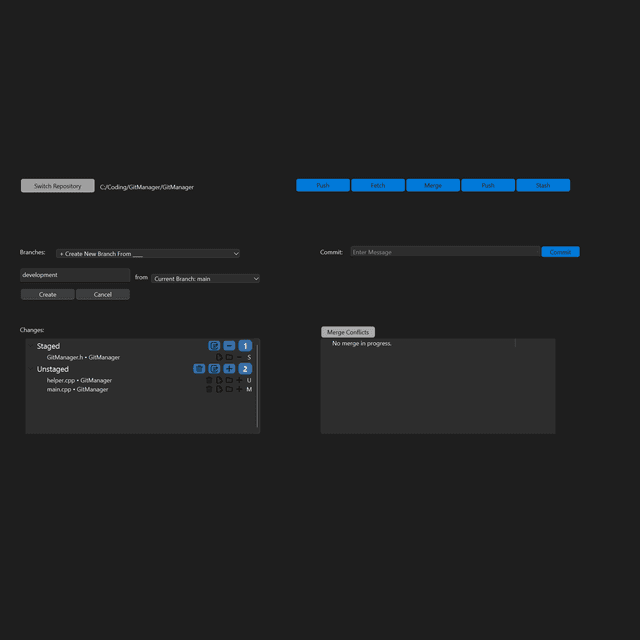 A client that makes using git easy for beginners. The client makes it easy to check out, create, rename, and delete branches. The client includes a UI for staging, unstaging, reverting, and committing changes. The client features a guided merge flow UI that assists beginners through merge conflicts. Built using C++, Qt, and libgit2 API.