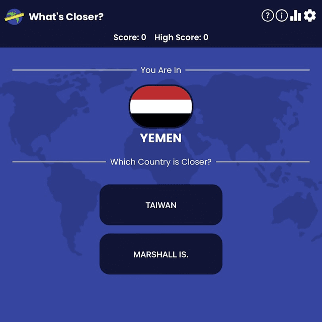 A fun geography game, where the player's goal is to build a streak by choosing which option is closer in distance to the starting country. The game features random round generation, customizable difficulty levels, and advanced algorithms for precise distance calculations. Over 5,000 monthly players at its peak. Built using JavaScript.